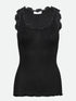 Das ikonische Top von Rosemunde verfügt über Spitzen am runden Ausschnitt und eine Lockenkante an der Unterseite, die den femininen Ausdruck vervollständigt. Das Oberteil ist in einer weichen, gerippten Seidenqualität ohne Seitennähte gefertigt und bietet so einen hohen Tragekomfort